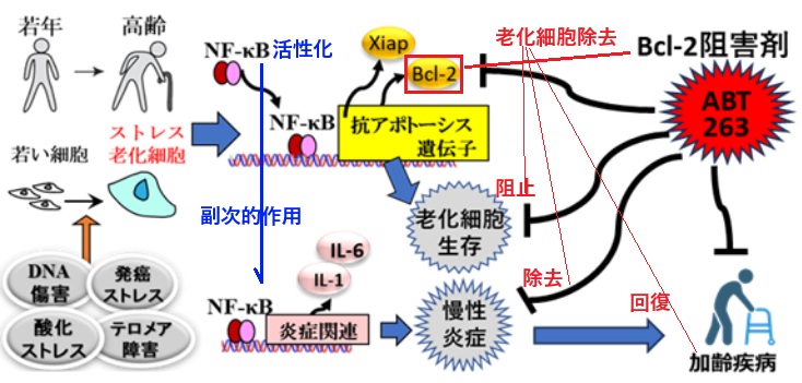 Bcl-2阻害薬(抗アポトーシス能を阻害)であるABT263は、老化細胞のアポトーシスを起こし、慢性炎症を除去、老化症状を改善する。