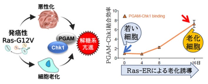 若い通常細胞では PGAM-Chk1 結合は観察されないので、PGAM-Chk1 結合阻害薬は、若い細胞には毒性を示さない一方で、老化培養細胞に選択的なアポトーシス(セノリシス)を誘導した。