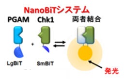最新NanoBit 技術により、細胞内の PGAM-Chk1 キナーゼ結合を可視化することに成功した。結合すると発光する。